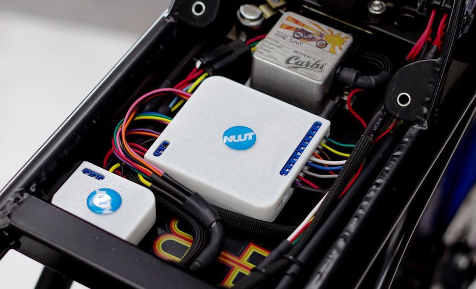 Цифровая приборная панель от Koso находится за небольшим ветровичком, под которым винтажного вида фара установлена на самодельных креплениях. Да и вообще мотоцикл усыпан самодельными деталями, включая скрытый сапун картера, алюминиевый перепускной бачок радиатора и нестандартную тягу переключения передач. Даже боковая подставка мотоцикла - самодельная.