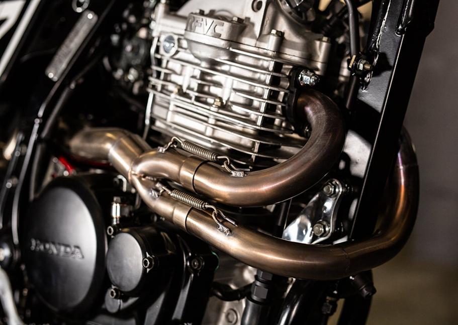 Была доработана и рама: установлена новая задняя секция, образующая злой "осиный" хвост. Затем были установлены кроссовые подножки и перенесена боковая подставка. После установки двигателя обратно в раму, настало время создавать выхлопную систему. Роберто с командой сделали её с нуля из множества сегментов нержавеющей стали, обогнувших головку цилиндра и трубы рамы. Оканчивается выхлопная труба плотненьким глушителем SuperTrapp.