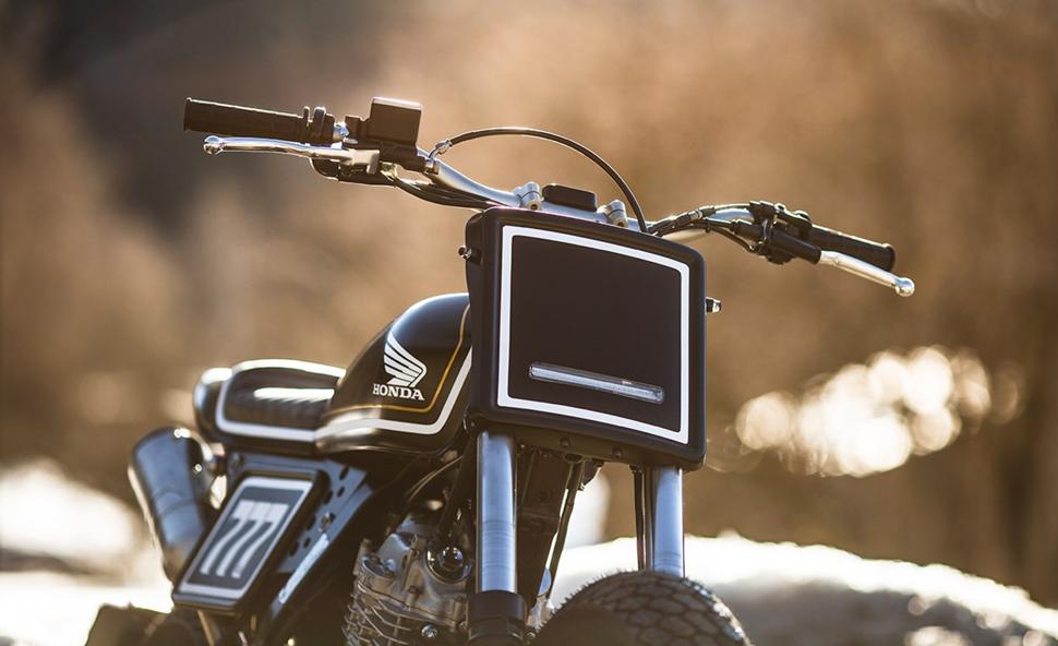 Новый руль оснащён цифровым спидометром Motogadget Motoscope Mini, новыми пультами и рычагами. Проводка тоже выполнена заново и аккуратно уложена в новом минималистичном стиле Dominator-а. Минимализм обычно не свойственен трекерам, но здесь смотрится идеально вкупе с полуматовой чёрной окраской с белыми и золотыми окантовками.