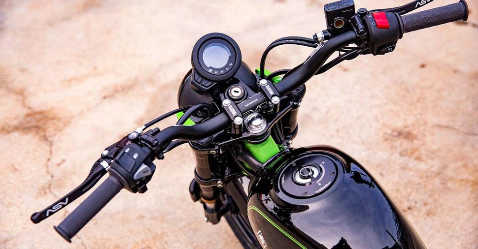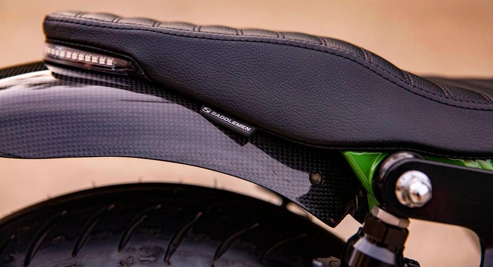 Закончив с доработками и всё проверив, раму окрасили в зелёный цвет порошковой краской, а бак отправили к Крису Вуду в Airtrix, который он нанёс двухтонную чёрную схему с зелёной окантовкой и инкрустировал карбоновыми вставками.