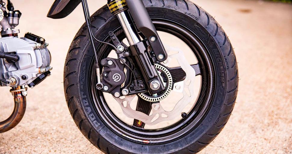 Для начала его Honda Monkey оснастили лёгкими карбоновыми колёсами от BST (да, они делают колёса специально под Monkey), обутыми в двухкомпаундную скутерную резину. Тормозная система состоит из суппортов Brembo на креплениях Chimera, волнистых дисков Galfer и магистралей Spiegler.