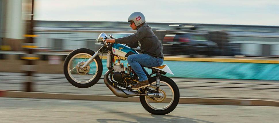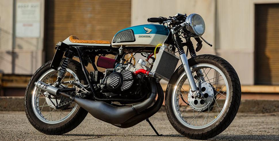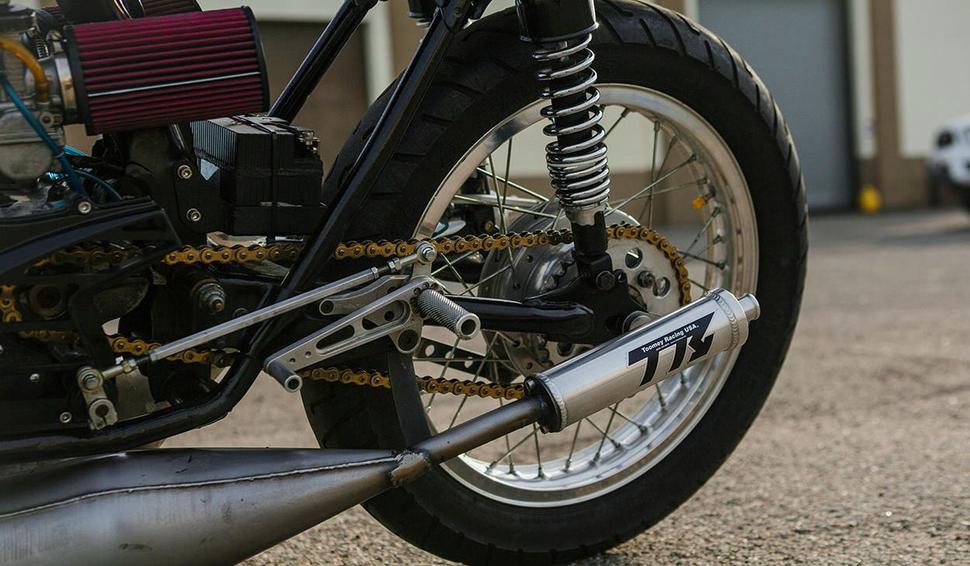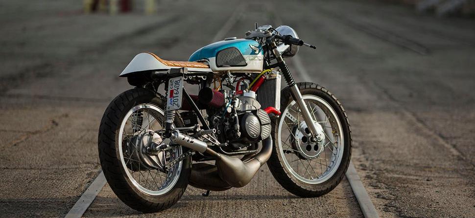 А вот ЭТОТ CL350 - решительно другое дело. Даже его имя, HonDeath, отражает его лютость, и ездить на таком дано не каждому. Потому что на нём установлен безумный двухтактный мотор от багги Yamaha Banshee с рабочим объёмом в 472куб.см и выдающий около сотни злых жеребцов.