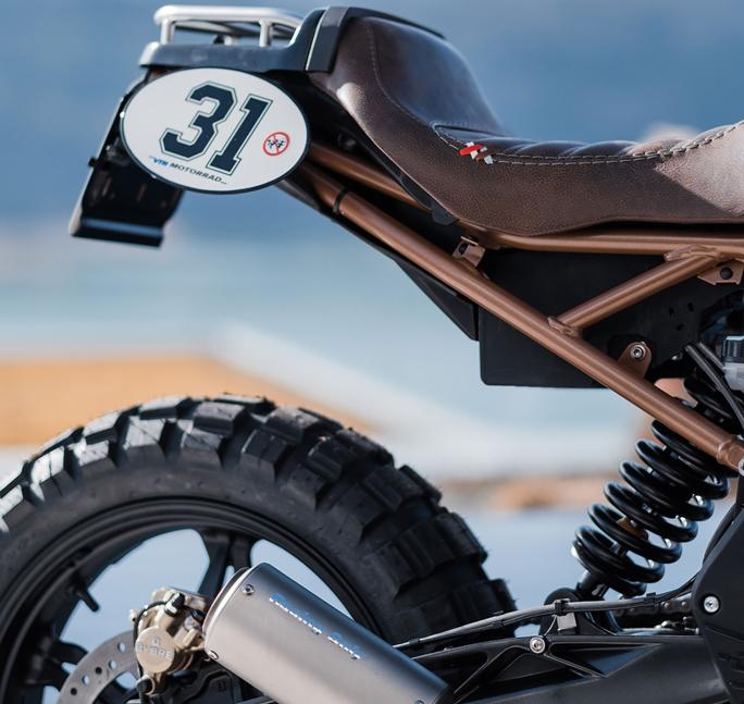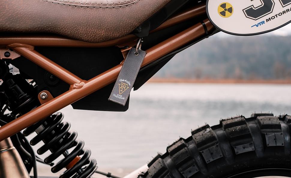 Ив Кнобель, обивщик команды VTR, обил новое сиденье дорогой, коричневой кожей. Цветные стежки сбоку в виде буквы X являются фирменным знаком VTR. Багажную полку нашли в каталоге запчастей для R nineT, она идеально подходит для спального мешка. Что касается задних фонарей, то здесь была установлена пара тройных светодиодов Kellermann.