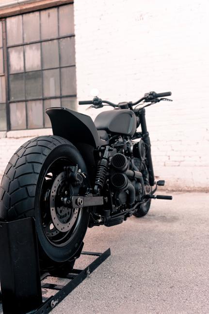 Кольт покрыл порошковой краской весь хром, подточил и просверлил рычаги на руле, заменил толстый руль на дюймовый трекеровый с внутренней проводкой, установил впуск от Kuryakyn и изготовил басовитый выхлоп. Затем он установил 7-дюймовую диодную фару Jeep и разместил по два небольших диодных поворотника от Joker Machine по бокам от неё.