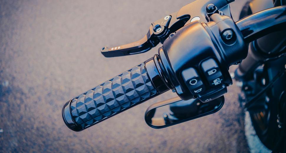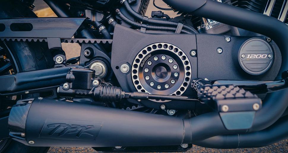 Спереди и без того суровый Roadster сделали ещё более суровым, установив на кастомную проставку почти прямой руль Low Bend Tracker Bar от Thrashin Supply Company, а вместе с ним - спидометр во фрезерованном анодированном кожухе от Rick’s Motorcycles.
