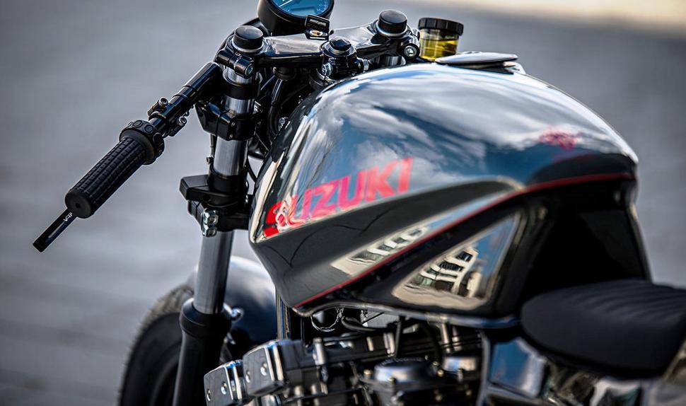 Возможно, этот Suzuki не является каноничным кафе-рейсером с прямым силуэтом, но смотрится он здорово, крепко сбитым и продуманным. Под стать его внешности и ливрея, подчёркивающая стройный новый силуэт - тёмно-серая с красными акцентами и логотипами Suzuki родом из той эпохи, когда он был выпущен.