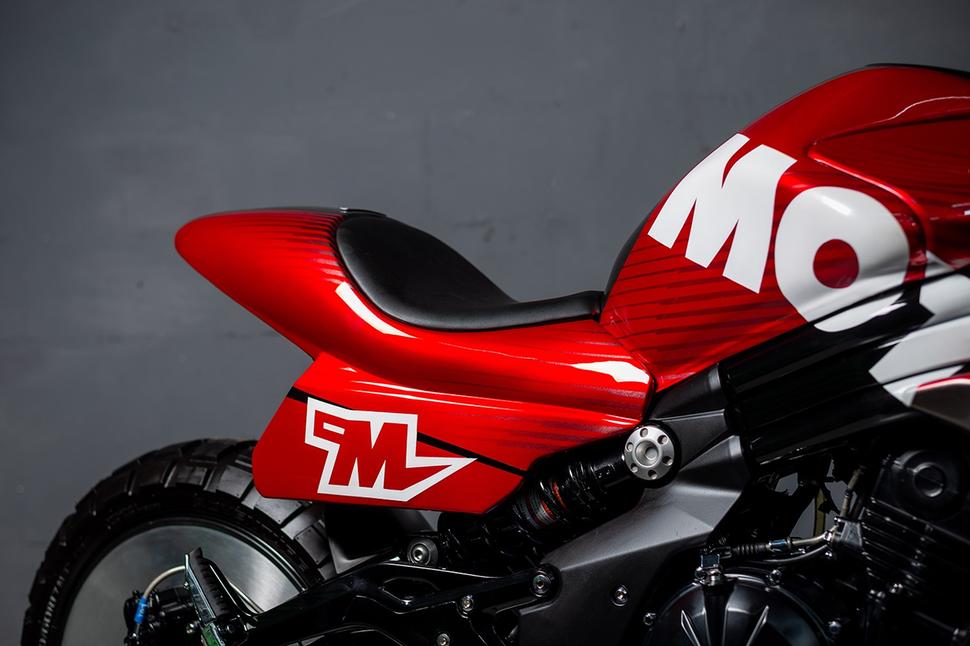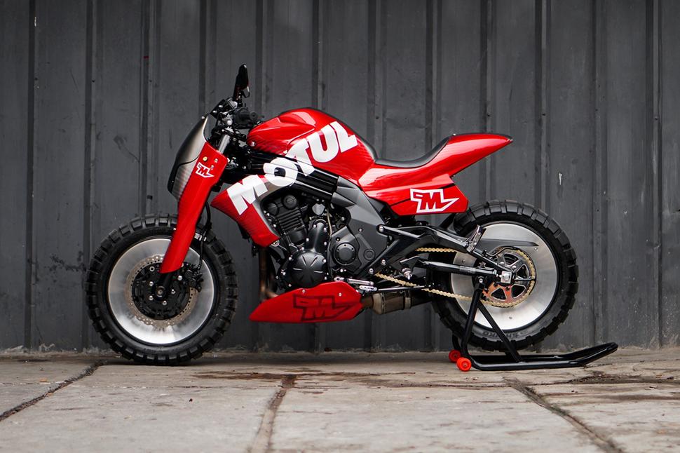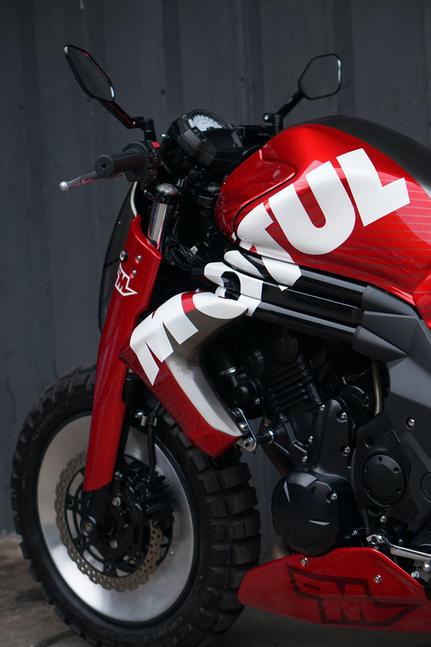 Расцветка во многом вдохновлена фирменными цветами Motul, но в смелой интерпретации: красный, тёмно-серый и чёрный сочетаются друг с другом как в единой форме, так и в взаимосвязанной графике, а логотип Motul нанесён по всему мотоциклу белым. В дизайн вплетено несколько кастомных шильдиков и наклеек с логотипами участников проекта, а сиденье отделано гладкой чёрной кожей. Атенкс понимал, что для дрифт-байка комплект колёс и резины должен быть особенным, но хотел сделать это доступным способом, который бы мог вдохновить других. Так что штатные диски остались, только на них установили сплошные заглушки, вогнутый дизайн которых помогает им выглядеть шире, чем на самом деле.