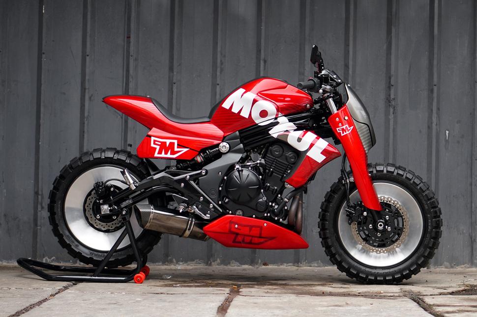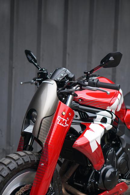 Вернув на мотоцикл штатную вилку Kawasaki ER-6, её одели в весьма симпатичный обтекаемый кожух. Две стороны кожуха аккуратно сливаются воедино в агрессивный передний обтекатель с кастомным значком Motul и галогеновым светом. Остальной обвес мотоцикла состоит из доработанного заводского бензобака, кастомного защитного поддона и тщательно отформованных боковых крышек спереди.