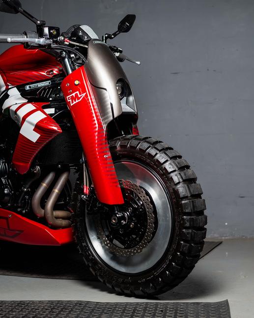 Колёса обуты в супер-агрессивную универсальную резину Shinko E805, позволяющую Зико давать угла на буквально любых поверхностях. Для того, чтобы придать рядной двойке внушительный голос, ребята оснастили мотоцикл полным выхлопом из нержавейки, который сходится внутри защитного поддона и оканчивается карбоновым наконечником глушителя, из которого выхлопные газы вырываются в атмосферу. Поворотниками служат крошечные диоды, а номерной знак установлен на оси для лаконичности.