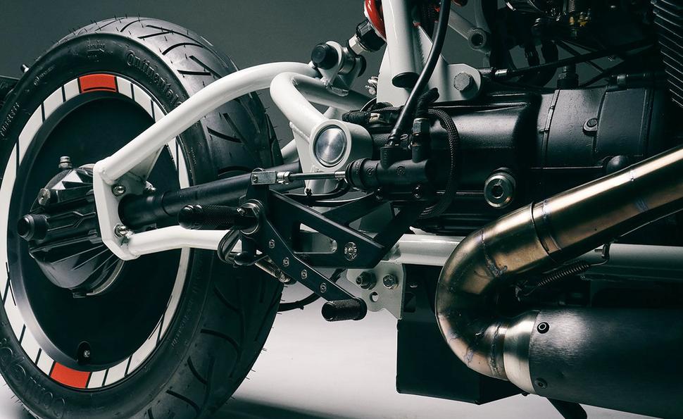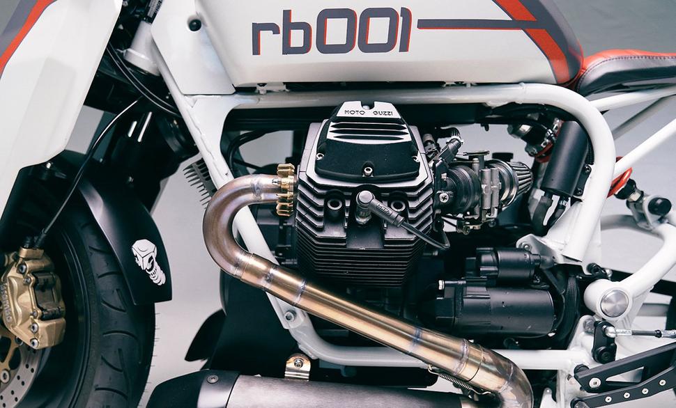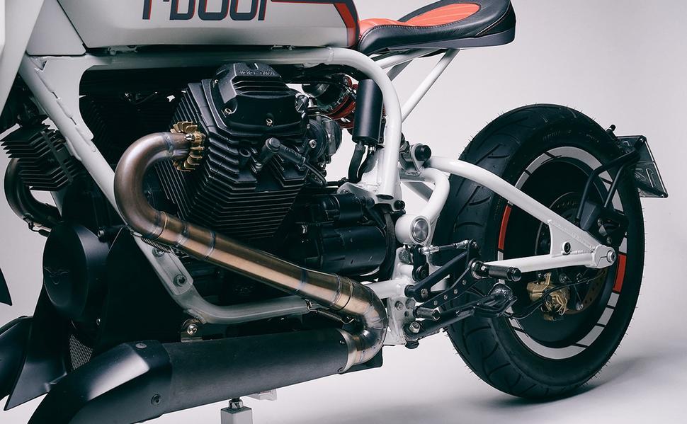 Некоторые из лучших частей Moto Guzzi скрыты от глаз. Например, быстросъёмный батарейный отсек, который крепится к тем же точкам, что и кастомные ножные рычаги, многочисленные защёлки для электронных устройств и самодельный маслоуловительный бачок.