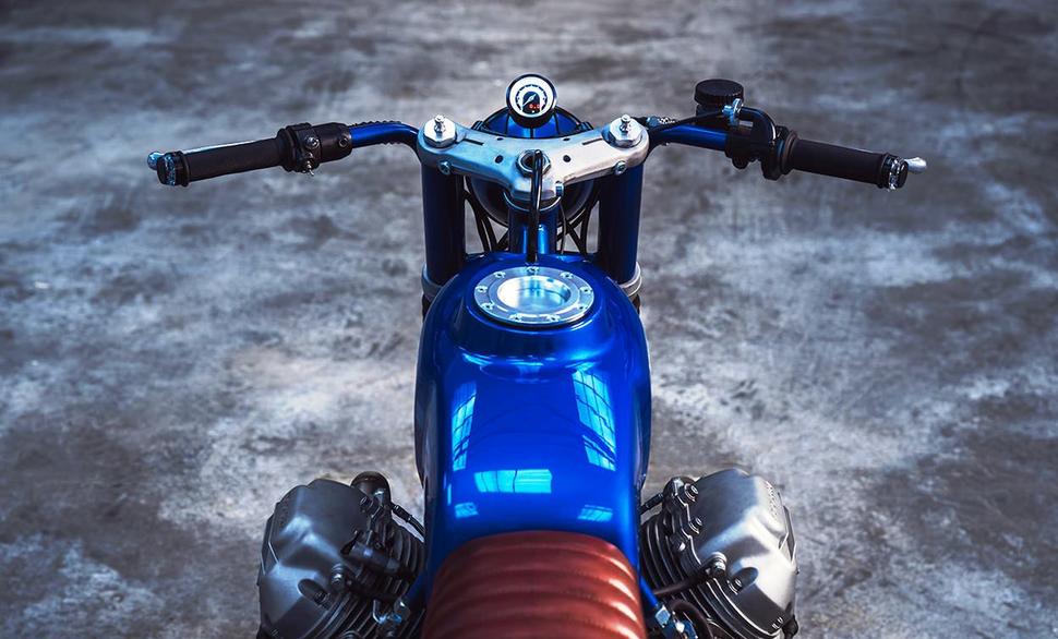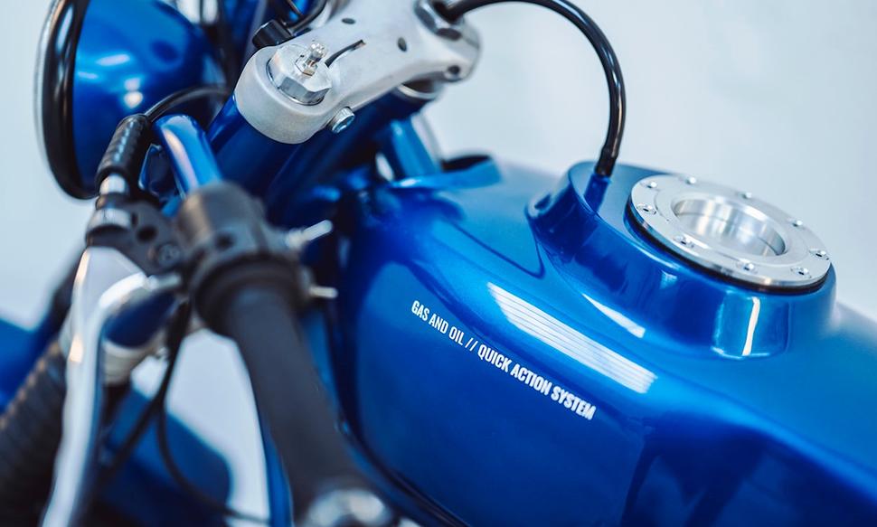 Яркая синяя краска - отсылка к итальянским спортивным расцветкам - распространяется и на необычно установленный самодельный руль, на котором стоят классические переключатели в напечатанных на 3D-принтере пультах. Компактная приборная панель - это MST Speedster от Motogadget. Также немецкий бренд предоставил поворотники в торцы руля mo.blaze, едва ли не самые современные компоненты этого в остальном ультра-классического проекта.