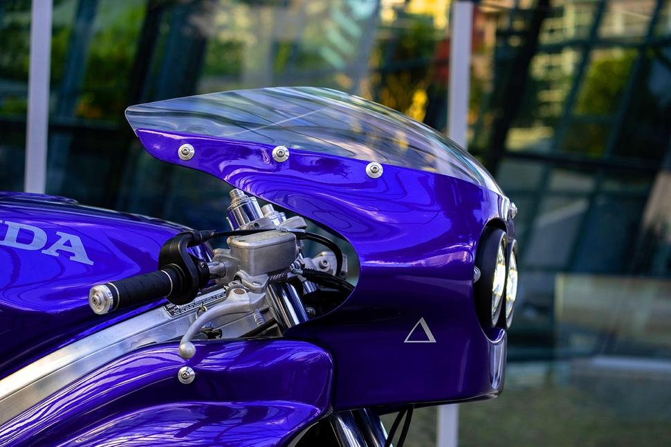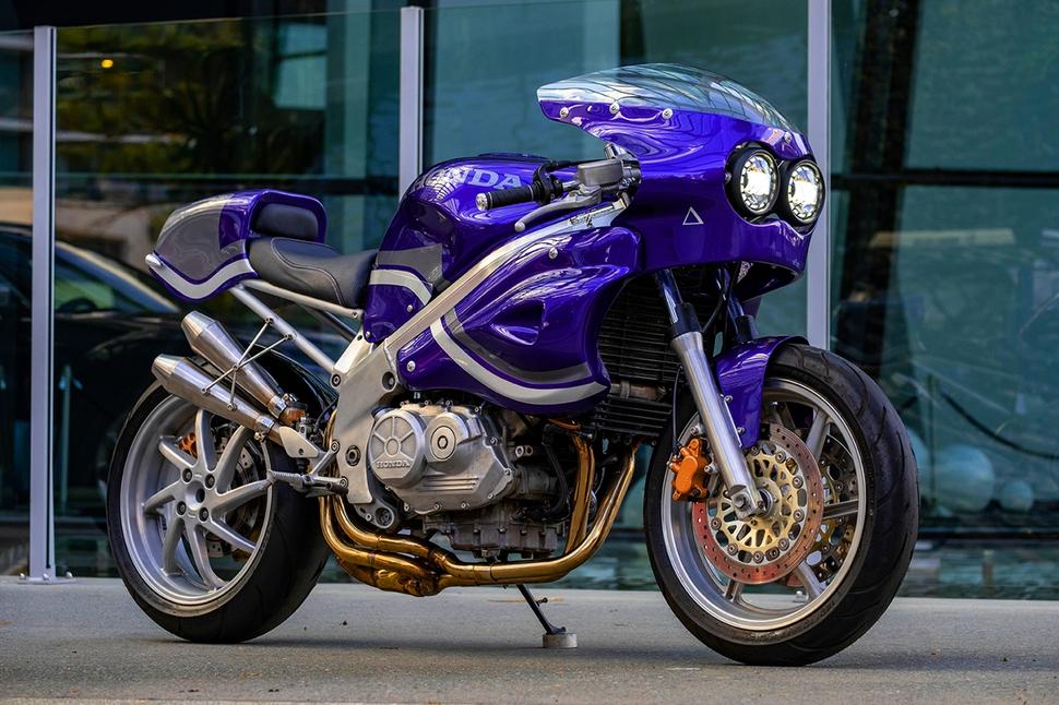 Чтобы новый пластик Honda VFR750 заиграл, Том зашёл с козырей - окрасил его пурпурным металликом в качестве основы и дополнил стальным серым и серебряным.