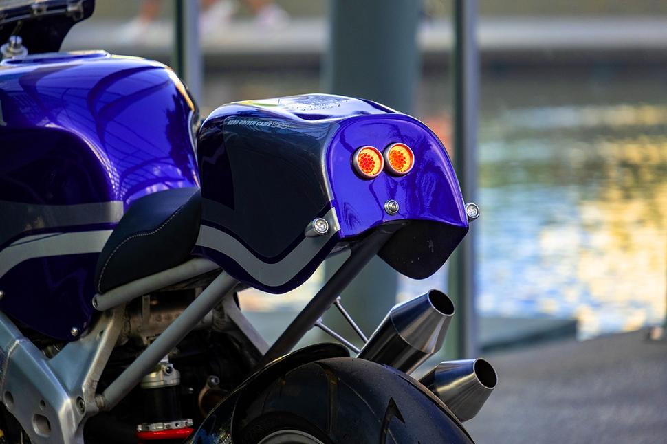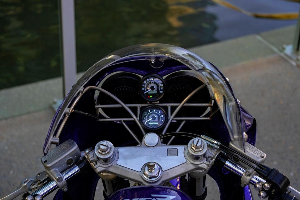 750-кубовый двухвальный V4 от Honda VFR750 тоже был доработан. В свою эпоху он считался одним из самых приятно звучащих двигателей, и Том решил полностью раскрыть эту тему: для начала он оснастил двигатель кастомными выпускными патрубками 2-в-1, изящно проходящими под двигателем, а затем надел на них пару 38-миллиметровых глушителей, подвешенных на декоративном X-Образном креплении.
