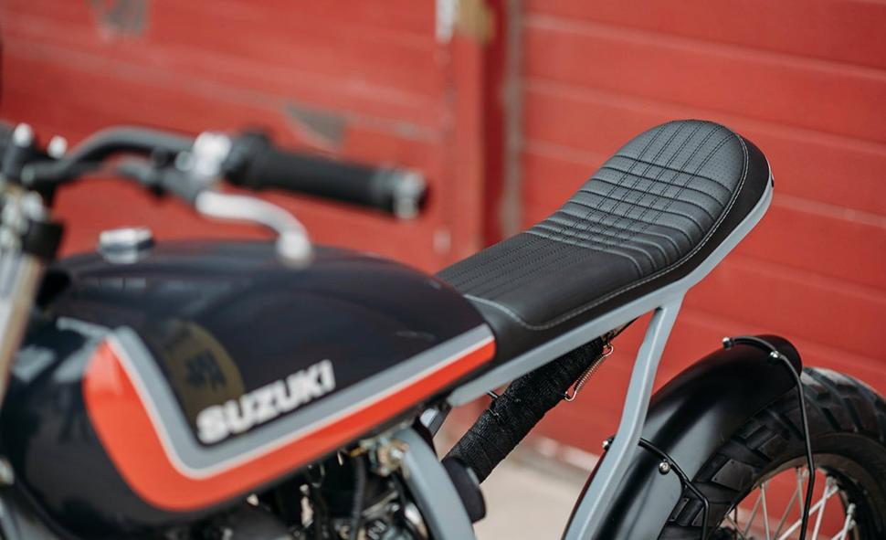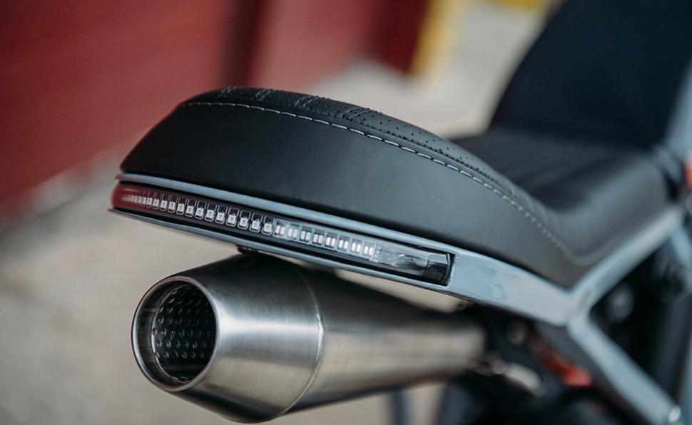 У кастома новый задний подрамник из стальных труб квадратного сечения, в который встроена светодиодная подсветка. Подрамник использует штатные точки крепления к раме, таким образом он может стать отдельным продуктом FEDERAL MOTO. Далее был заменен пластиковый топливный бак Suzuki DR-Z на бак от Yamaha SR500, который идеально встал на свое место. Также для бака была разработана новая графическая схема, которая гораздо привлекательнее желтого, в который обычно красят Suzuki DR-Z400. На подрамнике нашло свое место аккуратное минималистичное сидение.