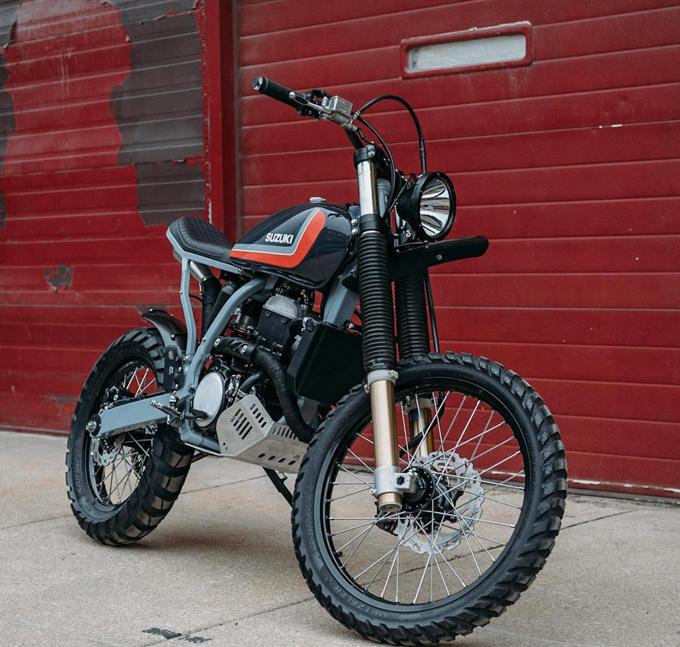 В этот раз клиент заказал постройку мотоцикла на базе Suzuki DR-Z400. Клиент - отец двоих детей, бизнесмен и городской житель, молодость его прошла в начале 90-х на мотоциклах Honda CR, Suzuki RM и Yamaha YZ. И ему нужен надёжный городской мотоцикл на каждый день. Под эти критерии идеально подошёл Suzuki DR-Z400. Старый DR-Z400 легко найти, он дешевый, и, если за ним следить, то он будет работать вечно. У мотоцикла зажигание CDI, электрический стартер, 21-дюймовое переднее колесо и хорошая подвеска Showa: 49-миллиметровая регулируемая вилка спереди и регулируемый задний амортизатор.