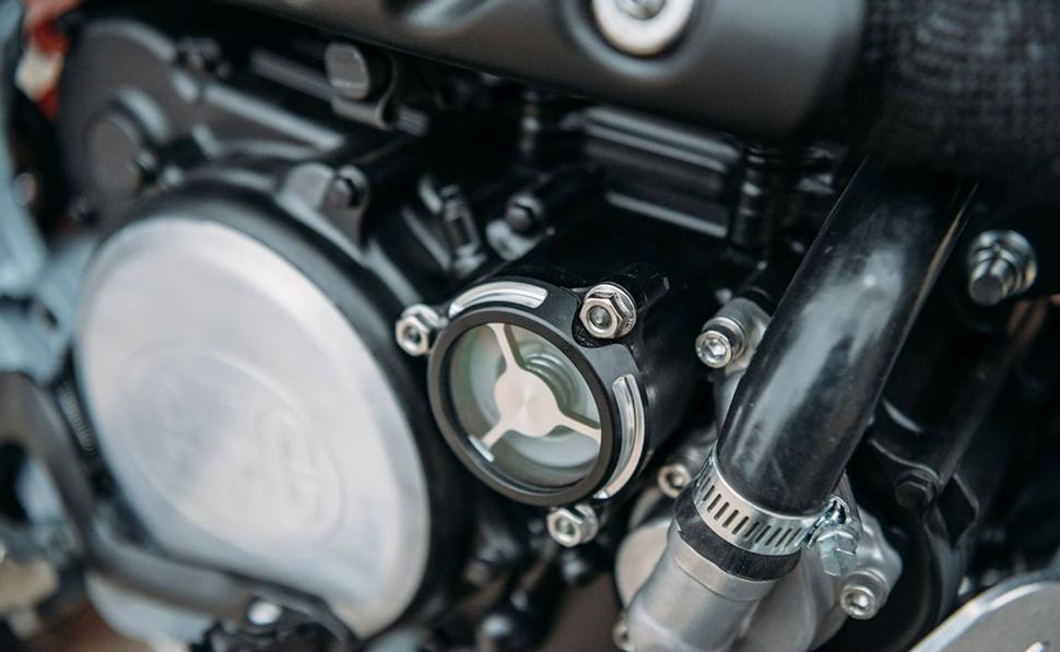 Мотор выглядит лучше, чем новый, благодаря сочетанию полированных и покрытых керамикой поверхностей. На мотоцикле установлена алюминиевая защита двигателя Devol Engineering, воздушный фильтр Uni с высокой пропускной способностью, а выхлопная труба выполнена в соответствии с геометрией подрамника. Выхлопная труба заканчивается 12-дюймовым глушителем Cone Engineering из нержавеющей стали.