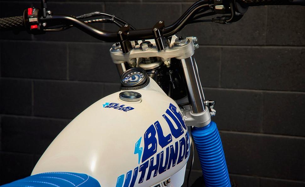Разобравшись с колёсами и крыльями, парни перебрали и настроили подвески. Ярко-синие гетры на вилке защищают её перья от грязи и отлично перекликаются с новой ливреей мотоцикла.