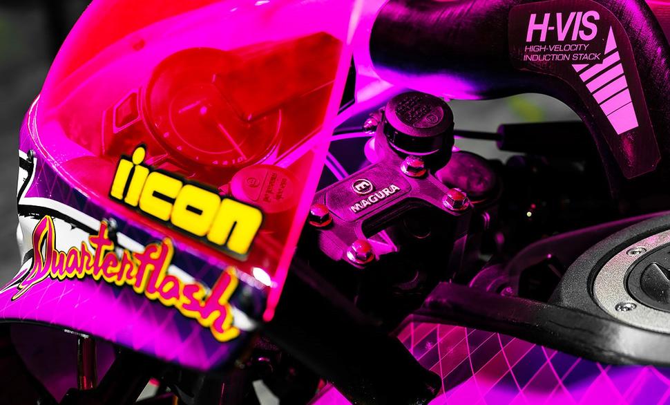 А тут ещё эта вырвиглазная ливрея, будто сошедшая с экранов аркадных автоматов из 80-х. Её дизайн безоговорочно отдаёт дань уважения новейшим шлемам и курткам от ICON.