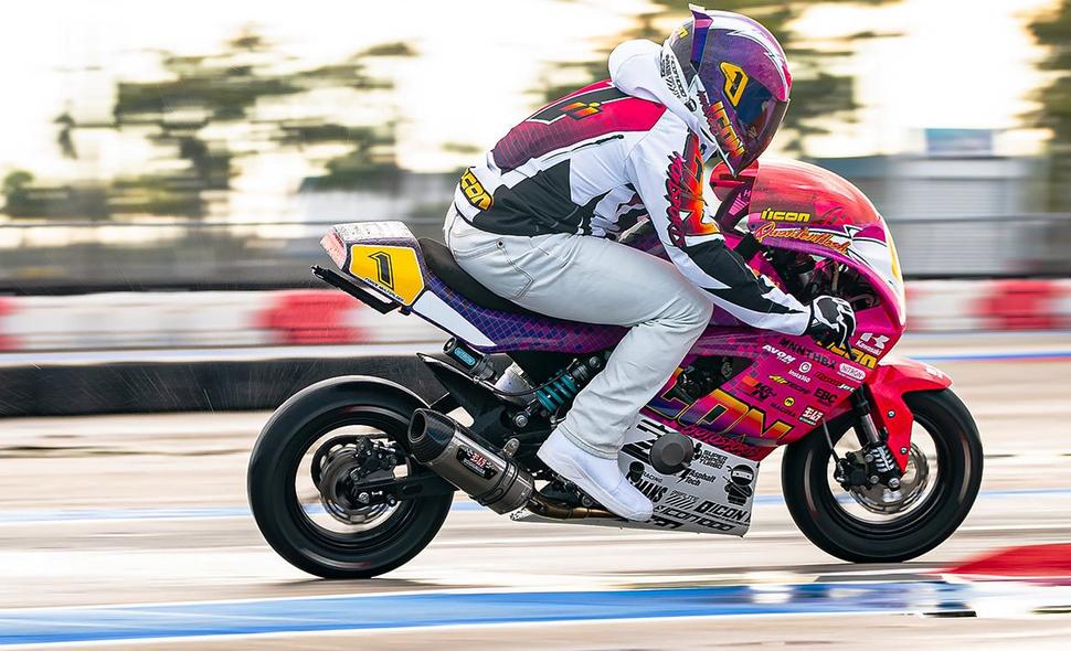 Есть в Теннесси такие ребята - MNNTHBX, и занимаются они лютым тюнингом малокубатурной техники. Вот к ним и обратились ICON за помощью, и те сумели им кое-что предложить - 155-кубовый комплект ЦПГ, усиленный коленвал, а заодно - впуск MTake их собственного производства. Затем ICON накинули полный выпуск Yoshimura, установили Dynojet Power Commander и комплект AutoTune, и немного поигравшись, добились того, чтобы Quarterflash и звучал, и ехал.