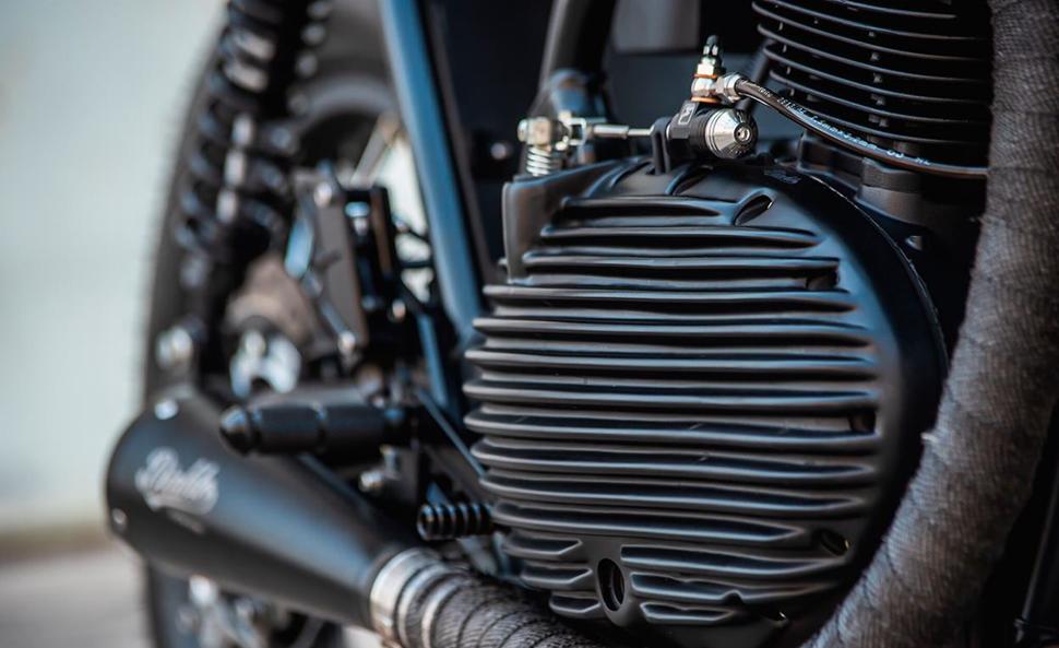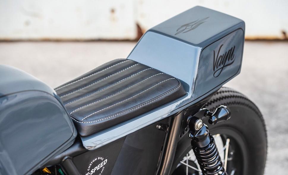Спереди они заменили классическую (но громоздкую) приборную панель с двумя стрелочными приборами на более компактную. Она крепится на изготовленных вручную креплениях позади кастомного обтекателя, оснащённого небольшой круглой фарой под стать заднему фонарю.