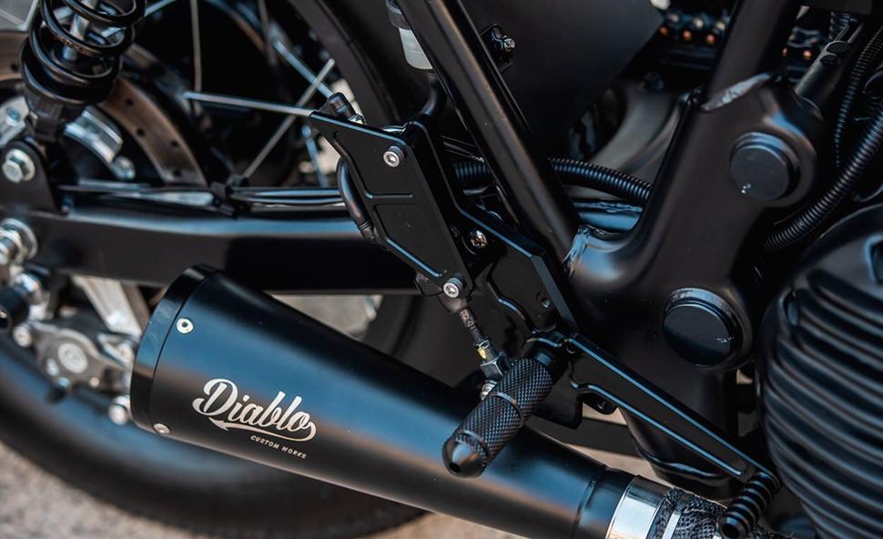 Позади обтекателя K-Speed установили на Royal Enfield Continental GT новые клипоны, гораздо более низкие, чем стоковые, с миниатюрными пультами и винтажно выглядящими грипсами. На клипоны поставили кастомные рычаги, а привод сцепления был заменён на гидравлический. Для более агрессивной посадки кастомные подножки были установлены ещё дальше назад.