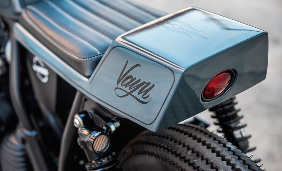 Окраска Enfield-а типична для K-Speed. Двигатель отделан матовым чёрным, а обвес стал тёмно-серым, плюс изящные окантовки и вручную выполненный леттеринг на баке и хвосте. На баке красуется имя Royal Enfield, а на хвосте написано “Vayu”. На языке Хинди Вайю - это повелитель ветра. “Это потому, что мотоцикл быстр и могуч, как ветер”, объяснили нам K-Speed.