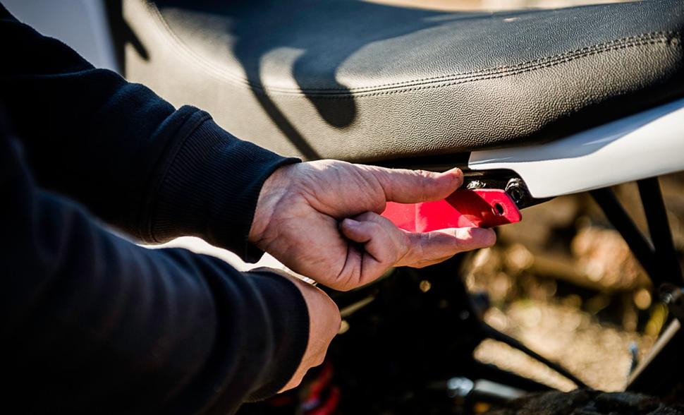 Если посмотреть на пространство между боковыми деталями пластика и задним крылом, то можно заметить пару красных пластин. Под ними расположены точки крепления, которые братья приварили к раме. Они предназначены для установки различных багажных аксессуаров. Очень умный ход.
