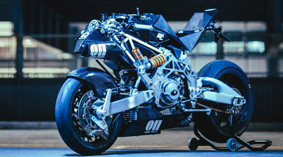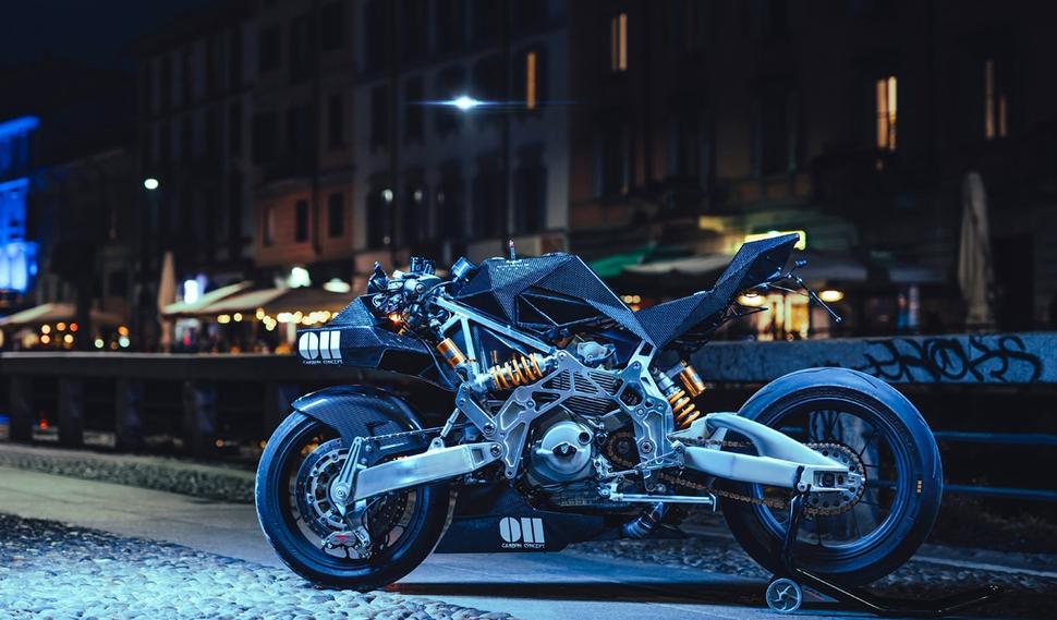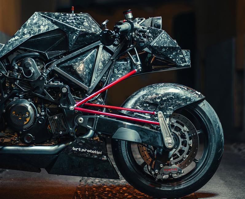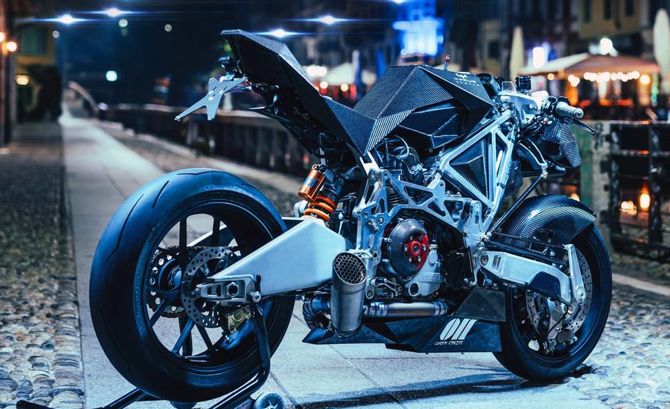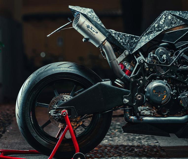 Частично скрытый под новой нижней защитой кастомный выхлоп может иметь разную компоновку: выхлопы разрабатываются Vtopia и изготавливаются из титана итальянскими спецами Spark. С ЧПУ парни из Vtopia тоже знакомы, поэтому они создали новые переднюю и заднюю части рамы из металла, для максимальной жёсткости, и соединили их с новым обвесом. Там, под всеми этими многоугольниками, прячется новый алюминиевый топливный бак.