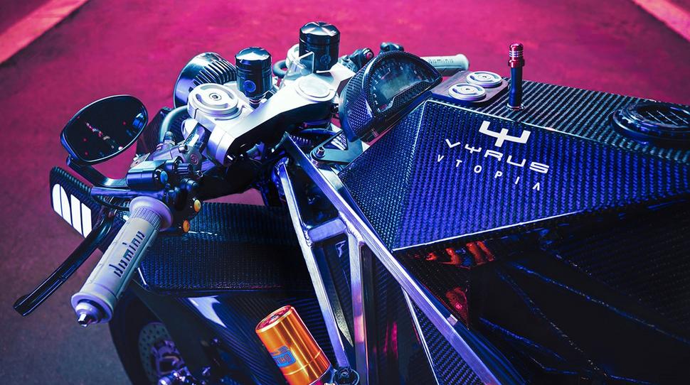 Характеристики мотоциклов Vyrus впечатляют: они при весе 150-160 кг развивают от 90 до 211лс - в зависимости от того, стоит ли там простенький двухклапанный Ducati или 1098R с нагнетателем. Кстати, у Vtopia в портфолио есть комплекты для Ducati Scrambler и Hypermotard, но это более традиционные продукты как по внешнему виду, так и по конструктиву.
