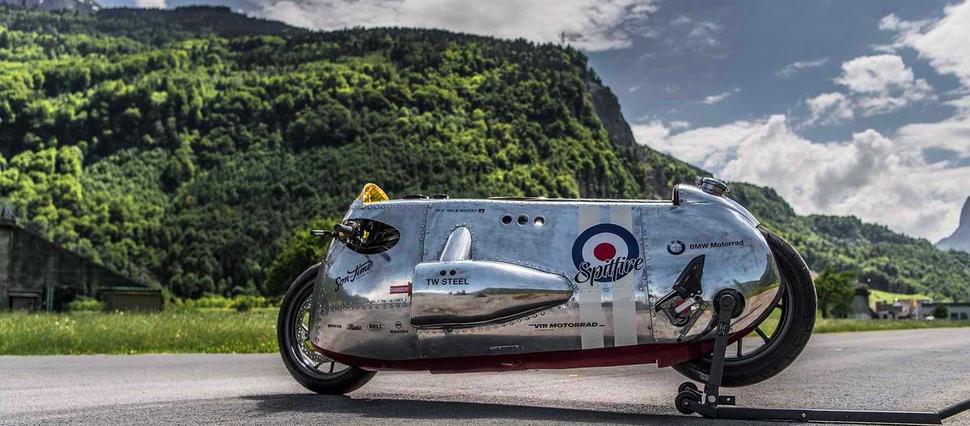 Военные самолёты Supermarine Spitfire были основой британских ВВС во время Второй Мировой войны. Они оснащались 12-цилиндровым двигателем жидкостного охлаждения Rolls-Royce P-12 и использовались в качестве истребителя, истребителя-перехватчика, истребителя-бомбардировщика и так далее. После войны Spitfire стал олицетворением инженерного и стратегического искусства эпохи Второй Мировой, и в честь этой модели швейцарская мастерская VTR Customs смоделировала кастомный дрэгстер BMW R 1200 R.
