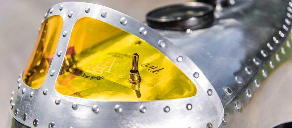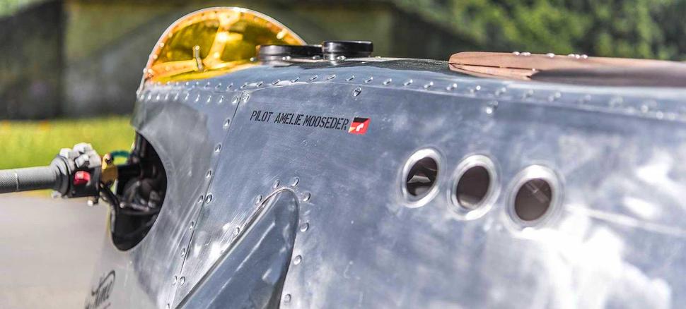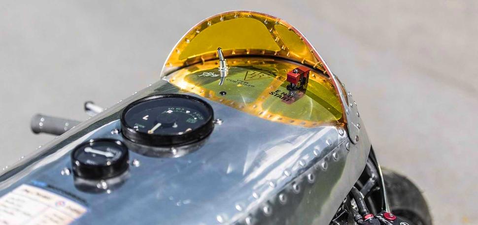 Но даже несмотря на огнедыщащий выхлоп, главное место в этом мотоцикле занимает его невероятный обвес. Британские ВВС, как мы уже упоминали, выпускали Spitfire в нескольких модификациях, и в том числе в камуфляжной ливрее и с акульим оскалом. Но Вайдманн выбрал полированную алюминиевую отделку. Состоящий из отдельных панелей, соединённых заклёпками, обвес дрэгстера идеально передаёт эстетику военных самолётов Второй Мировой. Начиная от круглых стикеров - "бычьих глаз" и до фальшивых выхлопных окон около носа, команда творчески адаптировала внешний вид истребителя к дизайну мотоцикла.