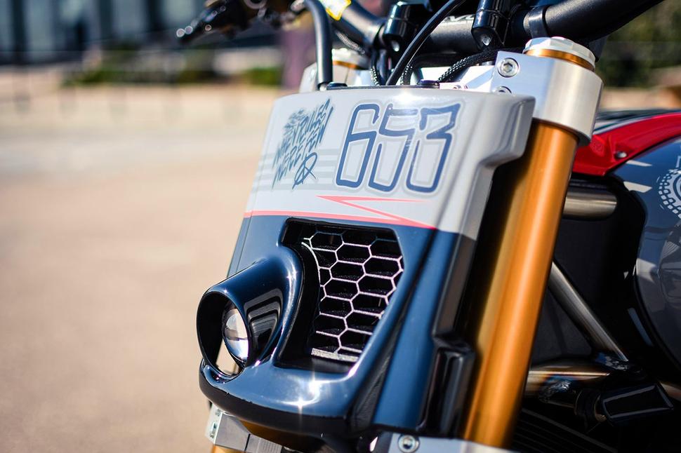 Большие V-твины любят вопреки всему - вибрациям, прожорливости, громкому звуку и так далее. Если вам не нравятся круизёры, которые хорошо ездят только по прямой, то есть шикарные варианты от KTM и Ducati, которые на прямике способны вырвать руки из плеч, и при этом готовы показать очень хорошее время на треке. Долгое время американцы не выпускали серийно ничего подобного, но Indian воплотил свои наработки во флэт-треке и других гонках, создав для асфальта FTR 1200. На этой платформе механики из Indian Metz, Томас Кастани и Алекси Масин, построили множество разных кастомов, а в этот раз им захотелось сделать что-нибудь весёлое и очень шустрое, вдохновлённое фристайл-мотокроссом. Речь, разумеется, не шла о прыжках боком или сальто назад, им просто хотелось перенести часть удовольствия и эстетики этой дисциплины на асфальт. Вместе с друзьями из L’Atelier 216 и спонсорами, такими, как мегабренд Fasthouse, они провернули эту работу довольно скоро.