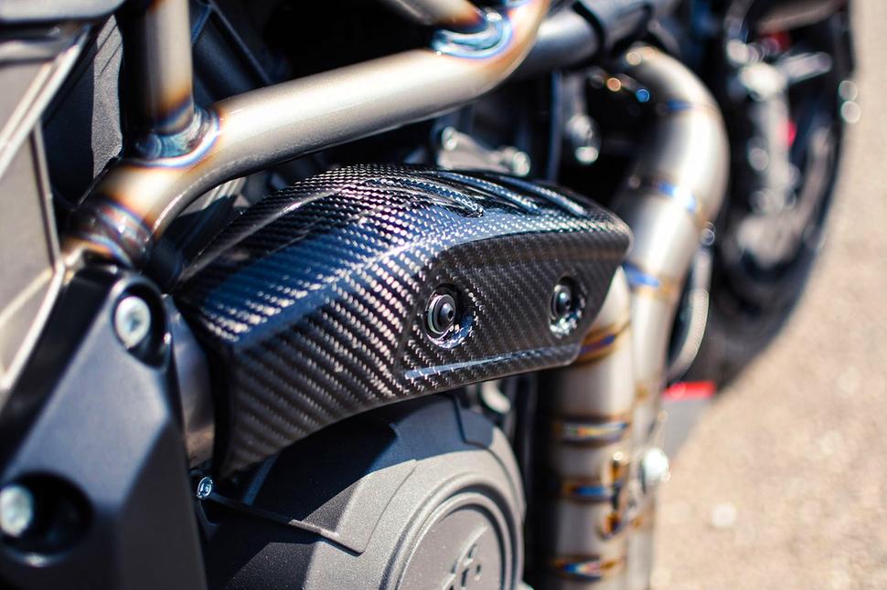 А затем настала череда вмешаться спецам по окраске суперкаров из AR Performance, которые смешали Audi Nardo Grey со множеством логотипов спонсоров и нанесли аэрографом аккуратную графику. Затем ребята из Metz оснастили двигатель полным выхлопом от Zard, идеально сочетающимся своей эстетикой с рамой и оканчивающимся глушителем Dr. Jekyll and Mr. Hyde с электронным управлением и тремя режимами звука. Кроссовой эстетики добавляют руль, подножки и грипсы от ProTaper, а также перенесённый одиночный спидометр.