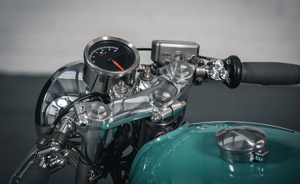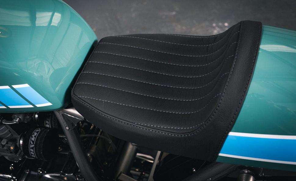 Сиденье предоставил сам заказчик, его довели до ума в Trim Deluxe. Сохранили оригинальный топливный бак, лишь немного модифицировали его, чтобы можно было установить топливозапровочную горловину в стиле Monza. Чудесную краску зеленого и голубого цвета предоставил местный мастер из S Jago Designs.