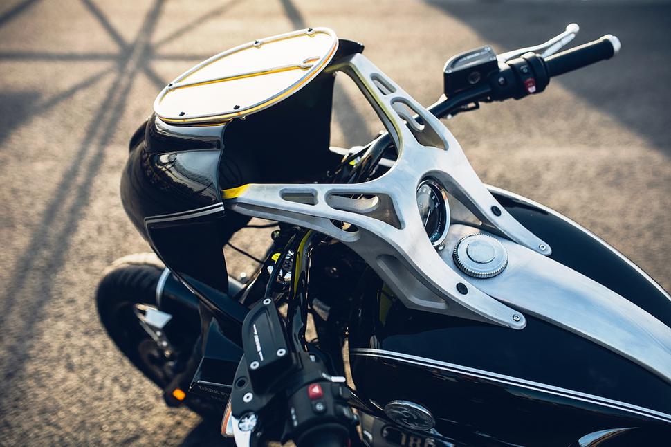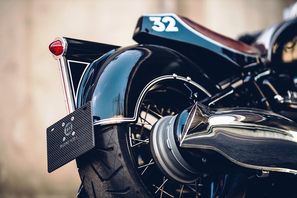 Дальше были хвост и заднее крыло, и вдохновение здесь ребята черпали в старых BMW с полной капотировкой. Но без старой подвески на двух амортизаторах всё было несколько проще, и хвост с седлом были выполнены в агрессивном стиле, переходящем в острый задний торец, а полное заднее крыло закрывает половину колеса и отсылает к тем временам, когда чем больше на мотоцикле было железа, тем лучше. Эти же отсылки - и в выборе стиля заднего фонаря. Его, кстати, изготовили самостоятельно, проявив традиционные навыки жестянщика и дополнив их современными технологиями.