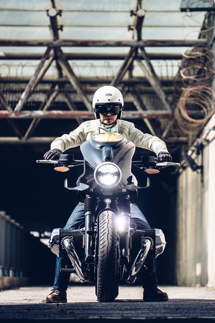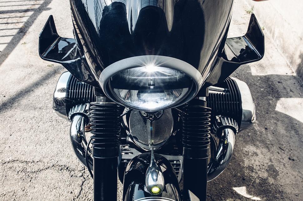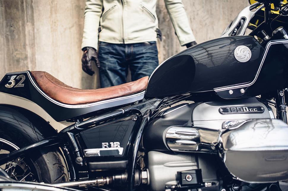 Прокатанное вручную переднее крыло полностью перекликается с остальным обвесом мотоцикла, а небольшой источник света на нём является ещё одним примером использования технологии 3D-печати металлом, когда специальный порошок превращается в готовый продукт. По-настоящему всё это связывает воедино классический чёрный цвет BMW с яркими белыми полосками, подчёркивающими силуэт. Плоский руль придаёт мотоциклу агрессивный вид (и стиль езды), а райдер сидит на шикарно обшитом сиденье из старой потёртой кожи.