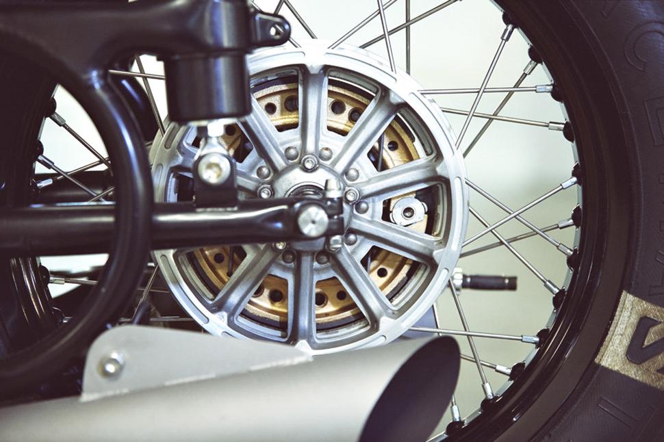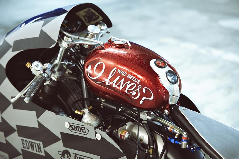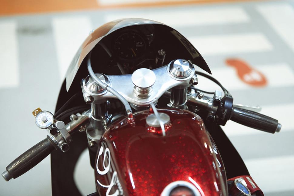 Однако были сохранены некоторые оригинальные компоненты, например, тахометр Scitsu, клип-он Menani, ручки Amal, ручка газа Domino GP и модифицированная маслоуловительная емкость Mooneyes. Седло, как и прежде, ничем не обитая алюминиевая панель.