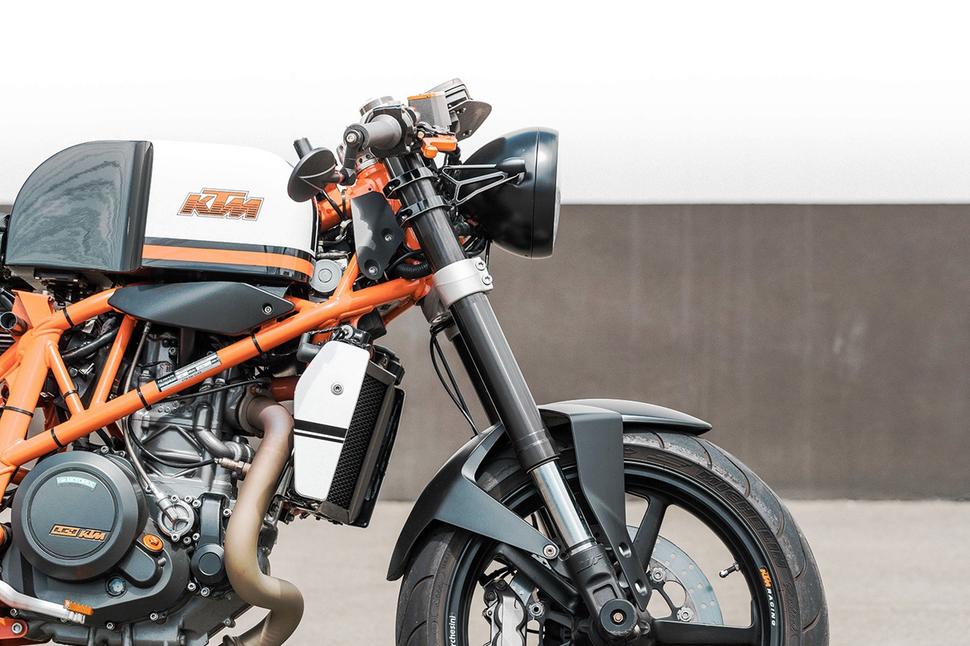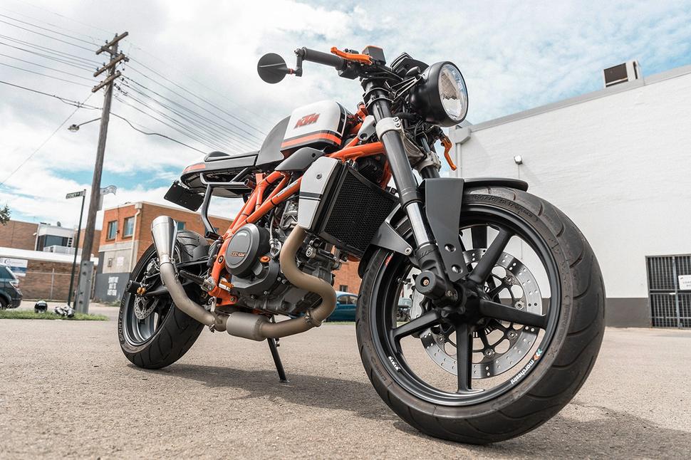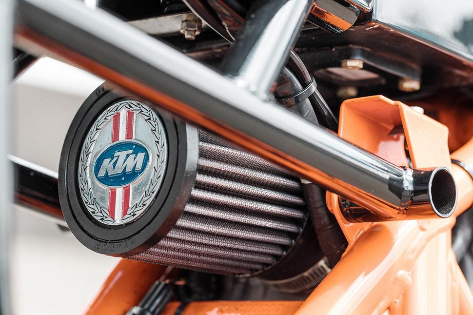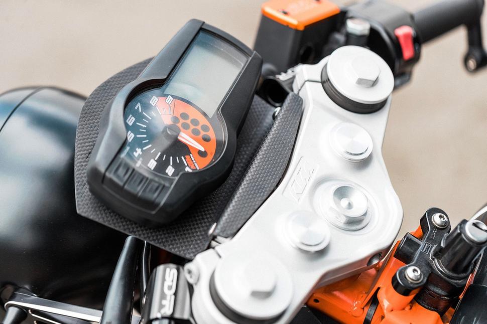 Как уже было сказано, KTM-овские мотоциклы выглядят одинаково - не только представители одной модели, но и вообще вся линейка. Даже окраска крайне редко выходит за пределы оранжево-чёрно-белой схемы, и с пятидесяти метров неспециалист вряд ли отличит бюджетный 125 Duke от крайне небюджетного сурового KTM 1290 Super Duke. Большинство тех, кто хочет изменить свой мотоцикл, идут простым путём: откручивают одни элементы и прикручивают теми же болтами другие. Но у Джеймса свой подход (хотя и не всегда чётко сформулированный):