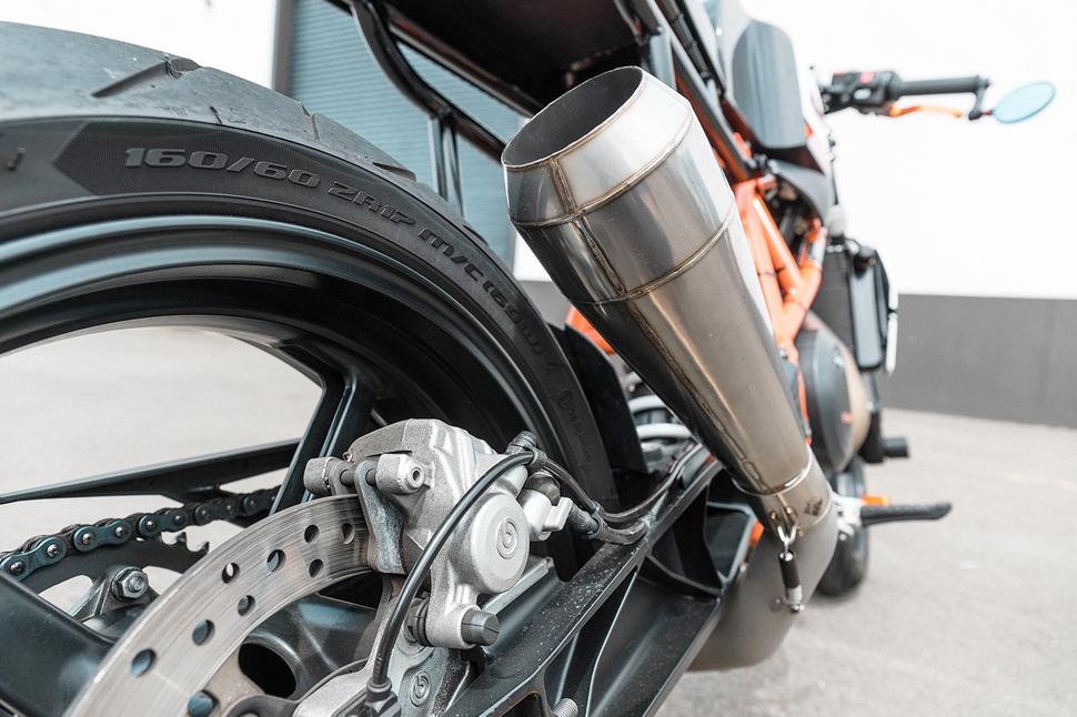 Но главное, что определяет характер KTM 690 Duke - это невероятная, незабываемая кубатурная одностволка с высокой степенью сжатия. Её звук было решено украсить, а не замаскировать - и большая заводская банка была заменена на маленький милый глушитель Tyga Maggot. Заводской аирбокс убрали ещё в процессе смены подрамника, и вместо него установили фильтр от K&N, ревущий впуском большого сердца мотоцикла.