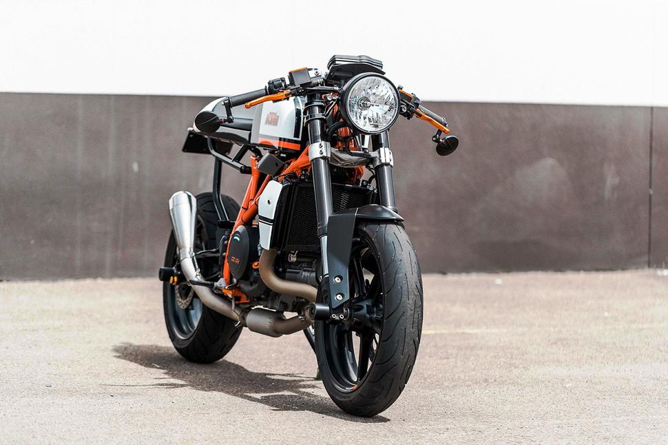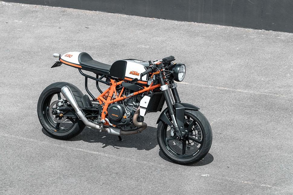 Для того, чтобы понять, с чем предстоит работать, Джеймс раздел KTM 690 Duke, отфотографировал получившиеся узлы и начал потихоньку собирать в уме дизайн. Первым шагом стал традиционный среди кастомайзеров отказ от штатного заднего подрамника, агрессивно задранного вверх и совершенно не подходящего для кафе-рейсера. Новый подрамник - произведение искусства, созданное из высококачественной хром-молибденовой стали и установленное на штатные крепления. Окрашенные в чёрное трубы подрамника имеют совершенно заводской вид и создают идеальный контраст оранжевым трубам рамы. Жёсткая конструкция прочна и надёжна, а под хвостовым обтекателем отлично вмещается аккумулятор.