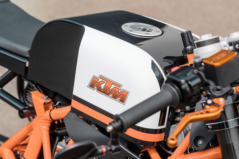 Покончив со сваркой, Джеймс приступил к окраске мотоцикла - вернее, обратился к единственному человеку, на которого мог положиться. Сэм Малдун из Colourfuel - звезда австралийской кастом-сцены, и его работами красуются многие призёры выставок. Схема была выбрана типично KTM-овская, но с акцентом на чёрный и белый, благодаря чему Duke приобрёл свой особый стиль. Довершают великолепно выполненную работу вручную нарисованные логотипы KTM потрясающего качества, а также широкие окантовки. Сиденье обшили и набили ребята из Bad Arse Trim Co., идеально попав в кафешную стилистику.