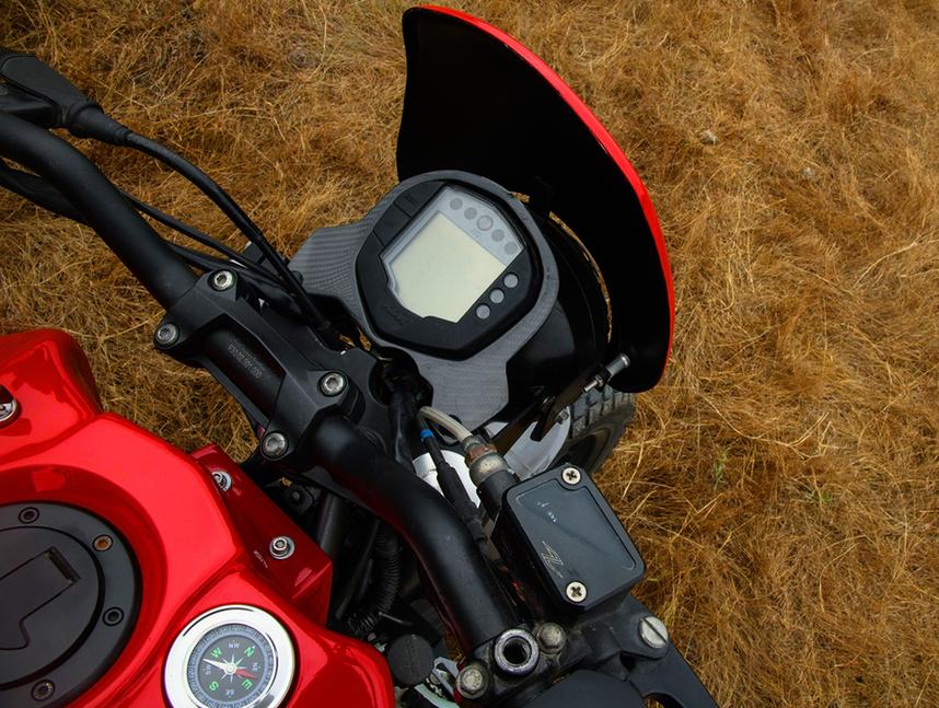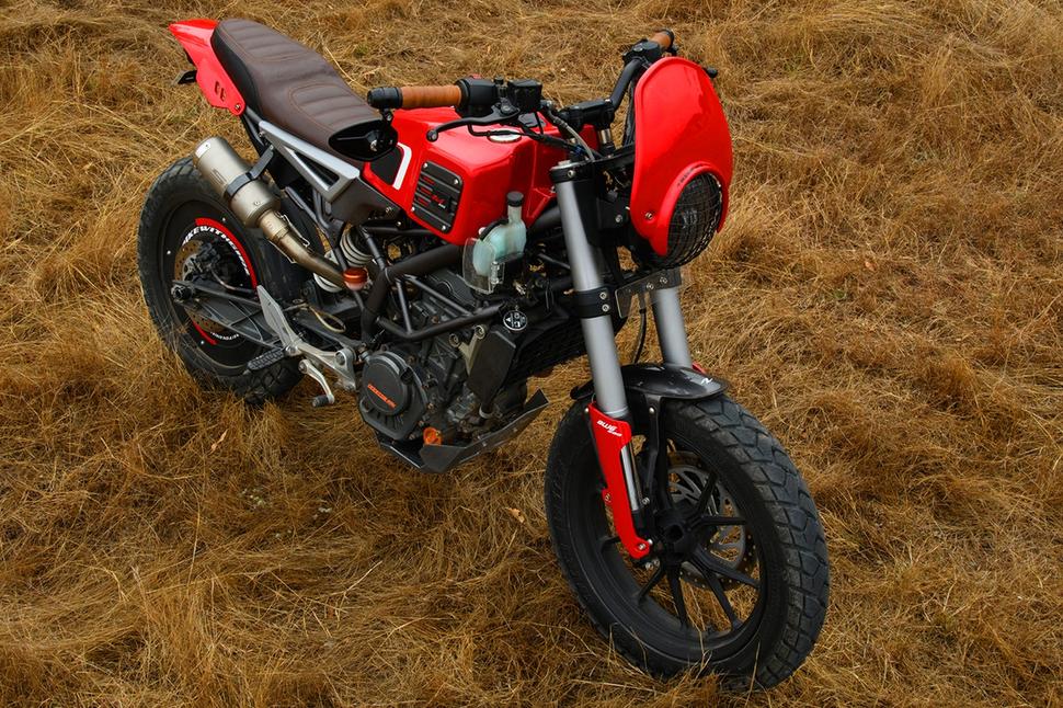 Лаконичный скремблерный дизайн KTM Duke 200 подчёркивают и самодельные крылья, практически незаметные по сравнению со стоковыми. Пластик радиатора и крепление приборной панели выполнены из топового современного материала - карбонового композита. Под стать высокому сиденью руль был установлен в высокие проставки, давая почти кроссовую посадку, а на случай совсем уж сложных условий мотоцикл дооснастили защитными элементами звезды и картера.