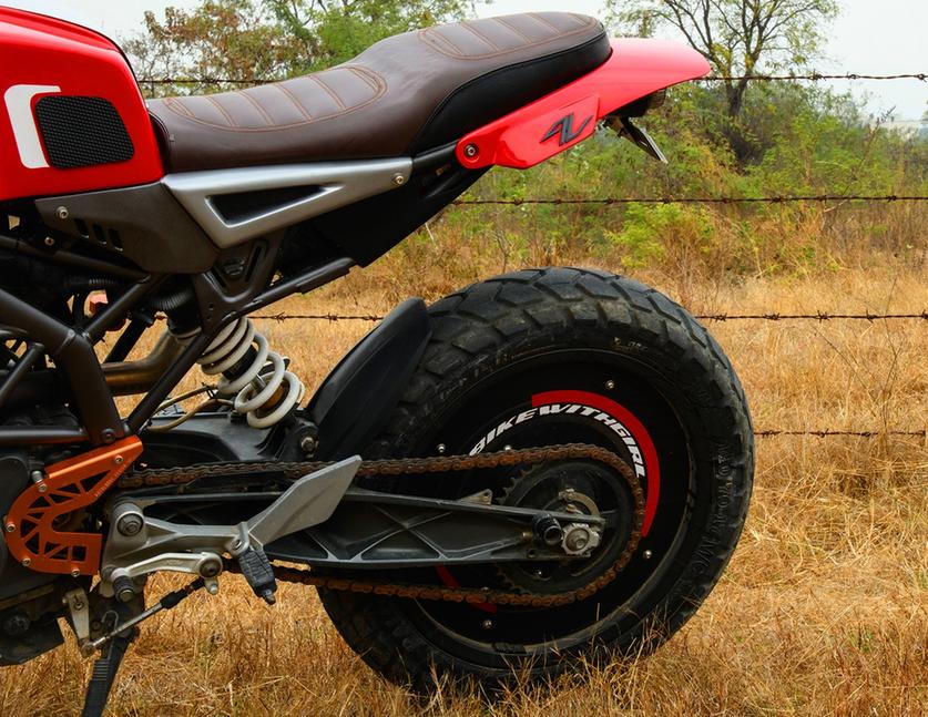 Значок на баке был непосредственно напечатан на 3D-принтере, как и крутой логотип BWG200. Встроенный в бак аналоговый мореходный компас резко контрастирует с ультра-современными формами и цифровыми технологиями двухколёсного чуда. Приянка отдельно упомянула, в какой цвет она хочет окрасить мотоцикл, и на высокотехнологичные элементы обвеса был нанесён яркий Rosso Corsa, придавший индо-австрийскому мотоциклу лёгкий итальянский флёр. Дополнительно его подчеркнуло кастомное сиденье, поднятое выше штатного и обшитое шикарной чёрно-коричневой кожей.