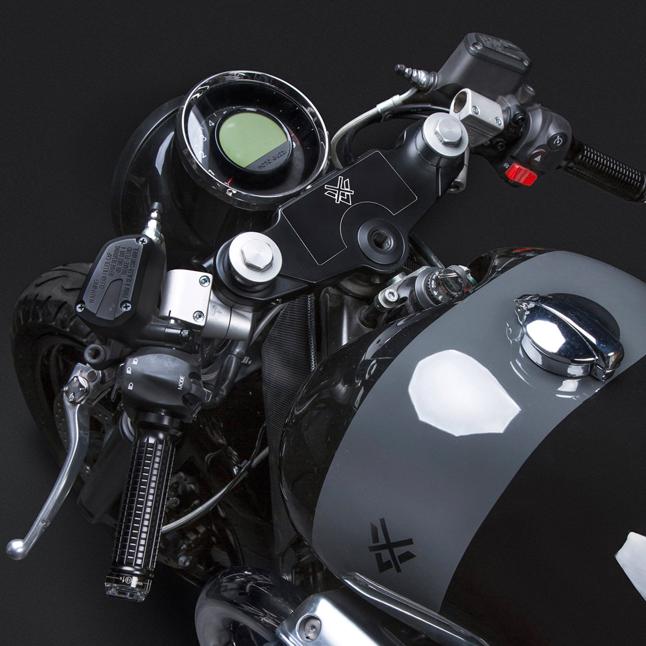 Что касается заднего фонаря, что он представляет собой аккуратный светодиодный стоп-сигнал, встроенный в седло. А задние сигналы поворота интегрированы в трубы рамы, передние от Motogadget—в руль. На мотоцикл установлены ножные органы управления и руль Tarozzi. Ручке на руле сделаны из алюминия.