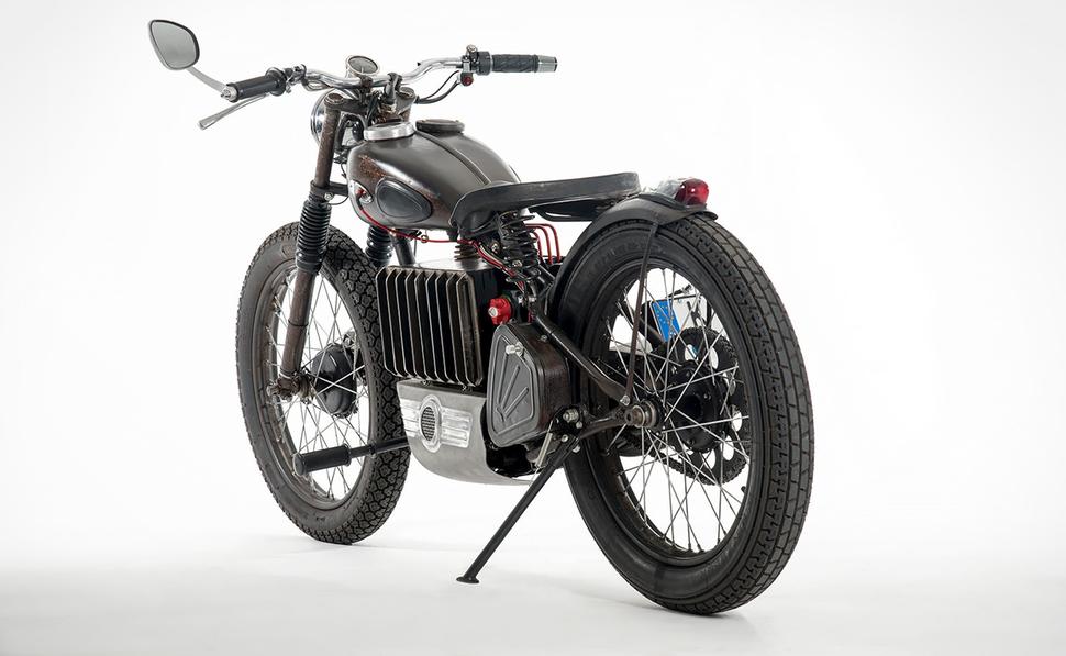 В бензобаке теперь стоит индикатор заряда и зарядное гнездо. За ним расположено оригинальное подпружиненное седло 1955 года, парящее над задним крылом, подрезанным и освобождённым от багажника. На крыле стоит габаритный огонь от дома на колёсах, приспособленный под задний фонарь.