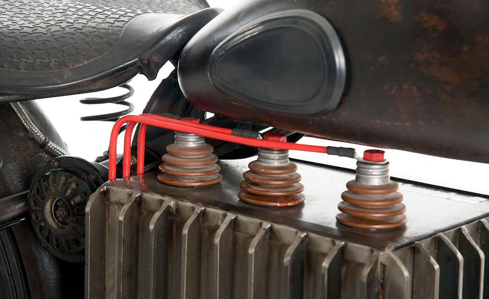 Кожух 45-ампер-часовой батареи имеет оребрение и украшен тремя раритетными высоковольтными изоляторами, которые сами по себе являются предметом вожделения коллекционеров и очень удачно подчёркивают эстетику винтажных электросистем. Ниже расположено самое интересное - мотор, а точнее - кастомный кожух, скрывающий его.