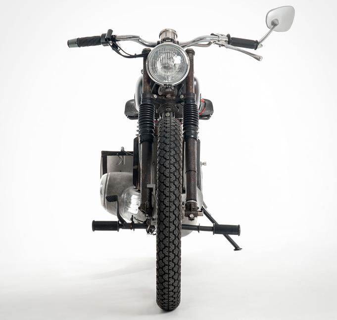 Оригинальный руль Минска был почищен, установлен на законное место и оснащён новыми органами управления. Пятидюймовая фара даёт намного больше света, чем штатная едва тлеющая лампочка, а простенький одиночный спидометр Daytona в очередной раз доказывает, что электроцикл - не синоним самоходного компьютера на двух колёсах. Мотор сейчас установлен там, где раньше были водительские подножки, и их перенесли вперёд, что только улучшило посадку и сделало её просторнее.