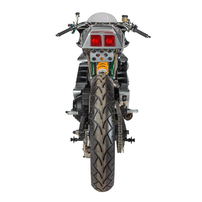 Потайной масляный бак представляет собой камеру, расположенную под задней частью рамы. Что касается топливного бака, то он также был изготовлен вручную под вдохновением от кафе-рейсеров (под обшивной в передней части спрятана проводка, аккумулятор и катушка зажигания).