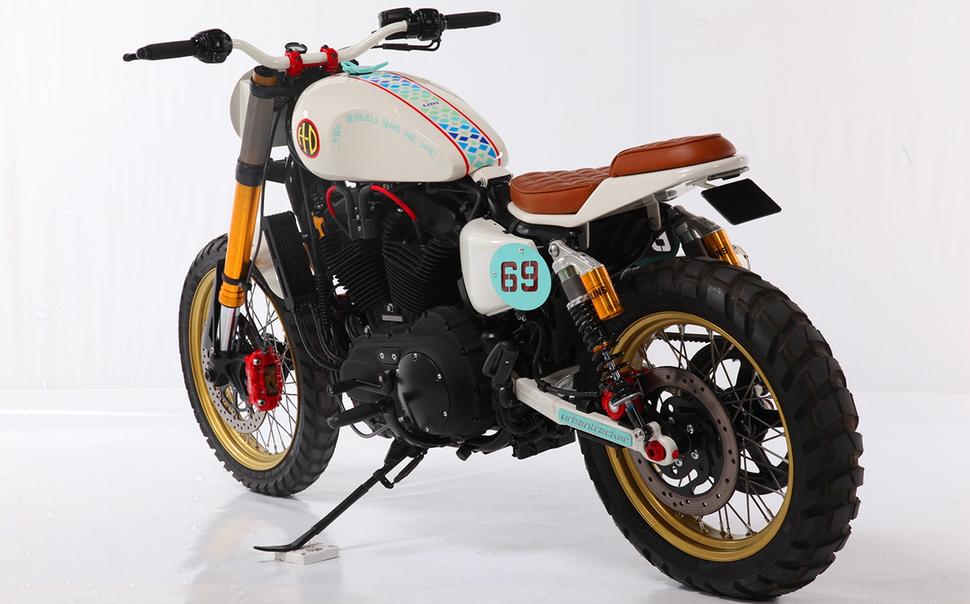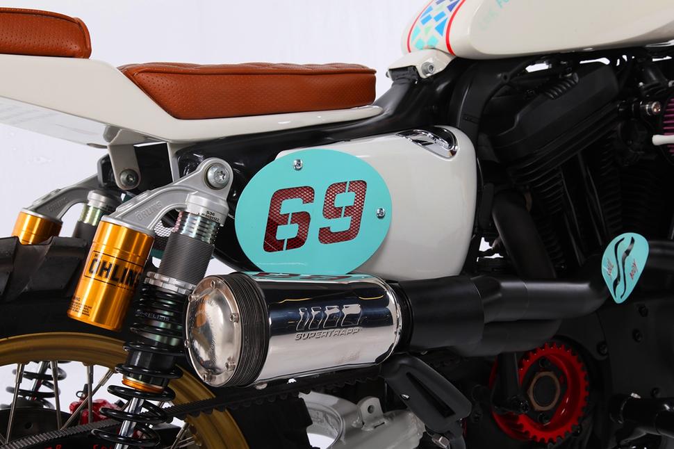 Выбор Harley Davidson Sportster 883 в качестве основы объясняется тем, что эта модель способна тащить двоих, оставаясь при этом довольно компактной. Дальше дело было за концепцией: сиденье будет парить над задним колесом, при этом должно выдерживать вес второго человека и хорошо смотреться. Для реализации этой задачи задняя часть рамы была отрезана, затем усилены точки крепления, а часть рамы прикрыта металлической пластиной. Шасси задули слоем чёрной краски, а маятник для контраста покрыли белой порошковой.