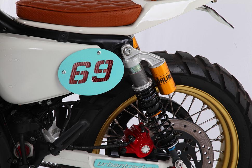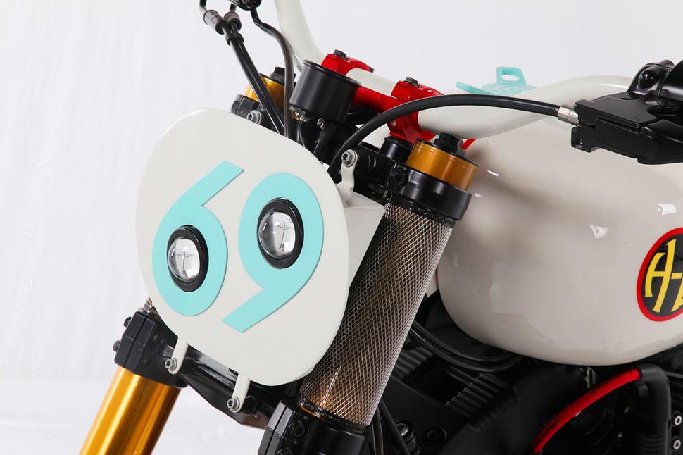 Обе подушки сидений обшиты перфорированной кожей с ромбической прострочкой и довольно комфортны. Остальной обвес довольно прост на фоне хвоста - короткое и плотно сидящее переднее крыло на новом креплении, над ним - номерная табличка ручного изготовления со встроенными линзованными фарами, цифры на которой выполнены из металла, а не просто нарисованы. Маленькие боковые номерные таблички изготовлены иначе - цифры вырезаны лазером, затем табличка окрашена, а за ней размещена окрашенная в контрастирующий цвет сетка. Стоковый бак оснащён забавной крышкой, а выемки под колени увеличены для вычурности.